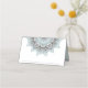 Um padrão de mandala legado em um gradiente de azul-ovo e cinza quente do soft robin junto com texto de script fluindo dá a esta elegante suíte de casamento que é luxuoso. O cartão de lugar de mesa de coordenação mostrado aqui tem um interior azul de ovo de robin opcional e uma modelo para adicionar facilmente suas próprias iniciais e data de casamento usando o modelo. Procure ID968 para ver outras peças neste lindo casamento.