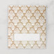 Placa de lugar dobrada em chic com aspecto brilhante dourado e fundo branco de damasco floral. Gráficos de uma placa de texto dourada, na frente está pronta para personalizar manualmente para cada convidado no seu casamento.