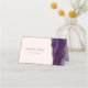 Este elegante cartão de lugar reservado para mesa de casamento moderno apresenta uma cor d'água púrpura e borda agitada com brilho dourado. A frente do cartão fornece espaços para o nome do convidado e o número da tabela. A palavra "mesa" aparece em um roteiro de escrita manual de cinzas de carvão com pinceladas antes e depois em um fundo cor-de-rosa pincelado. Personalize a parte de trás do cartão com os nomes da noiva e do noivo em escrita manual e a data do casamento abaixo. O plano de fundo da lavanda é repetido no dentro da placa.