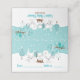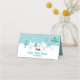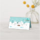 Este cartão de lugar de chá de fraldas giro e divertido apresenta uma adorável família de raposa-árctica em um cenário maravilhoso de inverno com árvores com capas de neve e um pássaro azul em um galho com holly. Ao fundo está um céu verde azul teal e flocos de neve caindo. O texto combina fontes decorativas e sans serif para um aspecto na moda e moderno. Isto é perfeito para um chá de fraldas temático de Natal ou inverno.