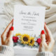A sunflower and red rose floral wedding table place card that includes the bride and groom's names along with their wedding date.