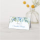 O design elegante para cartões de lugar apresenta flores azuis empoeiradas, cor d'água, misturadas ao eucalipto fresco verde e tecidas em falso quadro de ouro. Letra moderna de desenho manual. Não hesite em contactar-me para obter itens ou personalizações correspondentes. Rosas de lâmina ©