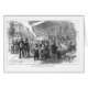 Um cartão que caracteriza uma gravura do vintage em preto e branco de uma cena do café da rua movimentada no bulevar Montmartre Paris, France, cerca de 1870.