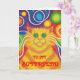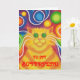 Querida Groovy! Um gato listrado amarelo e laranja com bigodes giratórios e um fundo de arco-íris psíquico com padrão. Cartão de saudação com um design personalizável amarelo, laranja, vermelho, azul, verde, rosa, roxo e branco para que você personalize com seu próprio texto, imagens e ideias.Um desenho colorido digitalmente aprimorado original de Jess Perry.