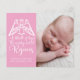 Um anjo elegante se senta sobre as letras de Natal de O Santa Noite neste lindo cartão de veraneio rosa e branco. Uma emoção de esperança, o mundo cansado se regozija. Congratulo-me com este adorável cartão de nascimento religioso com uma caligrafia deslumbrante e com a sua fotografia de recém-nascidos na frente e atrás. Um maravilhoso cartão de natal de menina cristã.