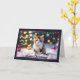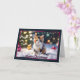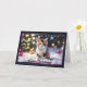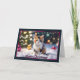 Este cartão festivo de Natal mostra um gatinho calico irresistível e fofo sentado numa terra maravilhosa de inverno nevado. O gatinho, com seus olhos brilhantes e pelo macio e multicolor, está rodeado de cintilantes lamparinas de árvores de Natal e ornamentos coloridos, criando um ambiente de férias mágico. Uma fronteira delicada, com moldes cor-de-rosa melhora o cartão, enquanto a saudação alegre "Feliz Natal" é elegantemente escrita no fundo. Perfeito para amantes de gatos e qualquer um que goste de um toque de chorona durante o feriado!