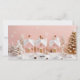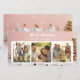 Este design de cartão de Natal apresenta uma cena invernal caprichosa com três casas cor-de-rosa cobertas de neve. As casas, com portas e janelas douradas, estão rodeadas por árvores carregadas de neve e pinhas, criando uma atmosfera festiva e aconchegante. O fundo rosa suave com flocos de neve brancos caindo adiciona um toque de charme e calor ao cartão. A frente do cartão inclui três espaços reservados para carregar fotos pessoais da família, permitindo que você adicione um toque pessoal aos seus cumprimentos de Natal. A inscrição "Feliz Natal" é elegantemente exibida, realçando o clima festivo do cartão.