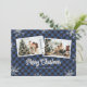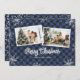 Cartão de Natal personalizado de xadrez prateada e azul de búfalo com flocos de neve e duas fotos contra um padrão de xadrez azul de búfalo. Personalize facilmente este cartão de Natal com fotos em flocos de neve com suas fotos e um nome de família.