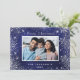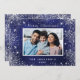 Um fundo azul profundo decorado com pó falso de cinza prateada, estrelas cintilantes. A cor azul é irregular. Personalize e adicione sua própria foto, nome e um ano. Com o texto: Feliz Natal.
