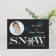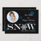 Um cartão de Natal não-denominacional com flocos de neve azúis e brancos, a palavra "Neve" e uma janela de foto circular contra um fundo preto.