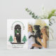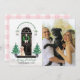 Com um Golden Retriever sorridente usando um cachecol rosa de tricô! Uma varanda frontal clássica decorada para as festas de fim de ano, apresentando árvores de Natal com estrelas ladeando a porta preta elegante, uma coroa de pinheiro com laço de gingão rosa e lanternas encimadas por rosas e azevinho. No estilo Magnolia | casa de fazenda moderna | clássico elegante. 3 CORES DE XADREZ PARA O FUNDO ESTÃO NO DESIGN (rosa como mostrado, verde escuro ou preto - basta editar e ocultar as que você não quiser). Adicione sua própria foto da família para um cumprimento pessoal de Natal!
