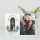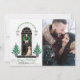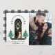 Com um doce Labrador amarelo (Labrador Retriever) usando uma gravata borboleta rosa com bolinhas! Uma varanda frontal clássica decorada para as festas de fim de ano, apresentando árvores de Natal com estrelas ladeando a elegante porta preta, uma coroa de pinheiro com laço de gingão rosa e lanternas encimadas com rosas e azevinho. No estilo Magnólia | fazenda moderna | clássico elegante. 3 CORES DE XADREZ PARA O FUNDO ESTÃO NO DESIGN (preto como mostrado, verde escuro ou rosa - basta editar e ocultar as imagens xadrez que você não deseja). Adicione sua própria foto da família para um cumprimento de Natal personalizado!