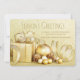 Ouro elegante Cartão de Natal corporativo com guião Gold Season's Saudações num fundo de ouro festivo. Este belo cartão de Natal corporativo de presente e ouro para ornamento é facilmente personalizado simplesmente adicionando sua mensagem e logotipo no estilo de fonte e na cor de sua escolha.