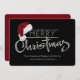 Um cartão de Natal corporativo moderno, com um roteiro de Natal feliz e um chapéu de Papai Noel em um fundo preto. Este cartão de Natal vermelho e prateado moderno é facilmente personalizado simplesmente adicionando sua mensagem e logotipo no estilo de fonte e na cor de sua escolha. Você também pode alterar a cor de fundo.