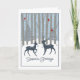 Esta pacífica cena de inverno mostra dois cervos na floresta em tons de azul e branco, com acentuados vermelhos de cardeais Nortes nas árvores. As palavras Saudações de Season estão centradas abaixo.