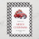 Xadrez de búfalos preto e branco Cartão de Natal feliz com um velho caminhão vermelho. Personalize facilmente este cartão de feriado com aquarela com o seu nome de família e o ano.