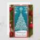 Elegante cartão de Natal com um design de árvore de floco de neve e ornamentos de feriado, cercado por ramos verdes.