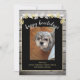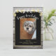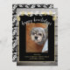 Cue, cartão de Natal de inverno personalizado rústico com uma foto do seu querido bebê peludo e "feliz como lidays" em tipografia divertida e moderna, bem como "Com amor, (nomes da família)". Folhagem branca e dourada com fundo preto. Tudo isso está contra um fundo de madeira rústica.