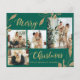 Orçamento, Elegante, Verde moderno e Botânico Dourado deixa 4 fotos de colagem feliz cartão de Natal. Este modelo de cartão de 4 fotos, festivo, mimalista e cômico, apresenta uma bonito colagem fotográfica, folhas botânicas de folha de ouro falso, winterberry e diz Feliz Natal! O texto de saudação de "Feliz Natal" é escrito em um belo tipo de letra tipográfica com letras de mão no fundo verde da floresta escura. No verso, uma fotografia horizontal com a armação de ouro e folhas de folhosas de folhas de ouro com brilho em verde. Bonito manutenção para sua família e amigos nesta época de Natal e Férias. Cartões de natal baratos.