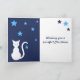 Um gato branco com uma estrela azul gelada pendurada na cauda. Na frente do cartão lê-se "Feliz Natal" e a dentro diz "Desejar-te um Natal Puro"
