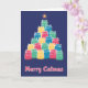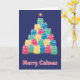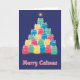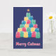 Um cartão de Natal colorido com gatos na forma de uma árvore de Natal. Fundo azul. A escrita na parte inferior do cartão diz "Feliz Gatnatal". Espaço em branco no interior para a sua própria mensagem. Tamanho 13 cm x 18 cm.