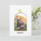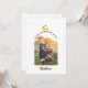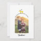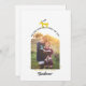 Uma rena mod se senta sobre uma foto de família arquitetada neste cartão de feriado branco e dourado.