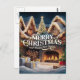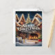 Um cartão de Natal festivo com uma lareira quente enfeitada com meias, com presentes lindamente embrulhados por baixo.