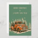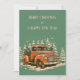 cartão retro de natal de um velho carro que levanta laranja na neve e pinheiros ao fundo