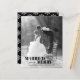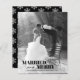 Celebre seu primeiro Natal junto com este lindo cartão de férias orçamentário. A design apresenta as palavras "Casado e Feliz" com sua foto. Adicione sua própria mensagem pessoal. A carta se inverte para um padrão de floco de neve em um fundo preto.