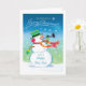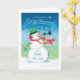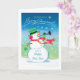 Um boneco de neve está tocando uma trombeta no vento de inverno enquanto seu cachecol também flutua com a corrente de ar neste cartão de férias musical. Flocos de neve estão caindo do título “Nós desejamos um Feliz Natal."