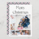Cartão de Natal simples e elegante com 5 fotos, personalizado com seus nomes e texto. Um padrão festivo de xadrez desenhado pela mão atrás. Perfeito para famílias que querem combinar uma colagem multifoto com estilo de Natal elegante e eterno. Este cartão de feriado combina personalização e humor festivo.