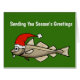 Uma saudação de Natal bobo para aqueles que gostam de trocadilhos, senso de humor ou gostam de pescar. Você pode personalizar com seu nome ou deixá-lo vazio e assinar o cartão com a mão. A design apresenta um bacalhau grande vestindo um chapéu e barba de Papai Noel. Desenhado por Sheila Cicchi, Brownielocks.com, Todos os Direitos Reservados.