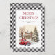 Caminhão vermelho em aquarela Cartão de Natal Merry com cenário de inverno e dentro de caminhão vermelho com quadro preto e branco de xadrez de búfalo.