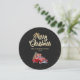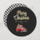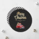 Xadrez preto e branco personalizado Cartão de Natal Merry com carregando vermelho-d-água de um caminhão de Natal e presentes contra um fundo preto enfeitado com neve caindo. Personalize facilmente este cartão de férias de caminhão vermelho com o seu nome familiar.