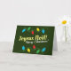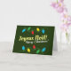 Cartão de Natal francês com Luzes de Natal. Diz Feliz Natal em francês e inglês.