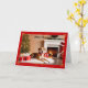 A frente deste cartão de Natal captura uma cena de feriado acolhedora, com um cão feliz deitado num tapete branco liso em frente a uma lareira calorosamente iluminada. O cachorro, adorado com um colar vermelho festivo, parece alegre e tranquilo, trazendo calor e charme ao cartão. Uma bela árvore de Natal decorada fica por perto, enfeitada com luzes e ornamentos de ouro. Caixas de presentes vermelhos com fitas brancas acrescentam ao ambiente de férias, enquanto um estoque de Natal e coroa completam o conforto e tradicional cenário. A saudação de "Feliz Natal" é exibida em uma elegante escrita preta no centro, enquanto uma rica borda vermelha com delicado filigre de ouro nos cantos enquadra a cena, acrescentando um toque de elegância. Este cartão é perfeito para amantes de animais de estimação e para qualquer um que desfruta de um cenário clássico de feriado animador.
