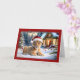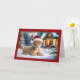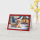 A frente deste cartão de Natal mostra uma imagem encantadora de um filhote de leão deitado na neve, vestindo um chapéu festivo de Papai Noel. O filhote olha adiante com uma curiosa e inocente expressão, cercado por decorações de férias. Ao fundo, uma cabana acolhedora é adornada com luzes e coroas de Natal, enquadrada por árvores de neve, dando à cena uma vibração pitoresca do inverno. O texto "Feliz Natal" aparece no topo com uma letra elegante e clássica, acrescentando ao espírito festivo. A borda do cartão é um vermelho profundo, melhorando a sensação de feriado e o fazer da imagem se destaca ainda mais. Este cartão seria perfeito para os amantes de os animais e para aqueles que desfrutam de uma divertida e animadora tomada de cartões de natal tradicionais. Transmite uma mensagem de calor, alegria, e a maravilha do Natal na natureza.