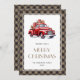 Xadrez de búfalos de Khaki. Cartão de Natal feliz com um caminhão vermelho clássico. Personalize facilmente este cartão de feriado com aquarela com o seu nome de família e o ano.