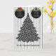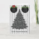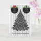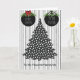 Cartão de Natal para Cabeleireiro com uma árvore pontilhada em preto e branco, bolas pretas com um laço xadrez vermelho, em um fundo listrado preto e branco.