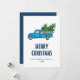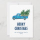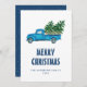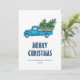 Vintage blue caminhão Merry Christmas card com a ilustração aquosa de um carregando azul de árvores de Natal.