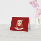 Cartão de saudação com uma ilustração de uma menina feliz sorridente com cabelo loiro curto, ela está vestindo um traje de Papai Noel vermelho e branco e segurando um presente; com modelo de texto editável para o seu nome ou mensagem, design de férias de Natal com fundo vermelho