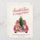 Envie alegria natalina com este cartão plano fofo com as palavras "Papai Noel está chegando!" com um caminhão vermelho antigo transportando uma árvore de Natal, presentes de Natal, chapéu do Papai Noel e passarinho.