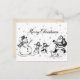 Elegante cartão postal de Natal preto e branco com um boneco de neve, Papai Noel e uma cena invernal caprichosa. Inclui o texto ‘Feliz Natal’ na frente