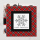 Um falso falso falso falso falso falso falso floco de neve decora este cartão com um padrão de xadrez preto e vermelho no fundo e as palavras Feliz Natal. Personalize-o com a sua própria saudação e adicione 5 das suas fotografias favoritas à parte de trás do cartão. Projetado para você pelo Blackberry Boulevard.