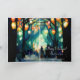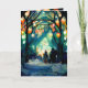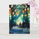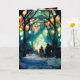 Este cartão de Natal apresenta uma reunião noturna numa floresta nevada entre as árvores com luzes a brilhar por cima. A arte é auxiliada por inteligência artificial em aquarela e estilizada ao estilo de Alphonse Mucha.