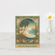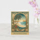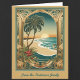 Este cartão de Natal tropical dobrado apresenta uma imagem tradicional em estilo art nouveau de um arco dourado com uma palmeira, praia e belo pôr do sol.