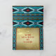 Personalize este cartão de Natal "Único" do Sudoeste Kokopelli! Ele apresenta um Kokopelli do Sudoeste turquesa tocando flauta com notas musicais em um fundo de Natal dourado e estrelas, cercado por bordas turquesa, ferrugem e preto e as palavras edificantes... "Paz na Terra"!