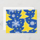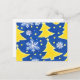 Este cartão de Natal festivo é uma homenagem à beleza dos Invernos Ucranianos, que incluem ouros de árvores de Natal amarelas e intrincados flocos de neve brancos contra um fundo azul vibrante. É uma maneira sincera de compartilhar a alegria da estação com um toque da herança ucraniana.