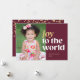 Este cartão de foto festivo de Natal apresenta a frase "Alegria ao mundo" escrita em tipografia dourada e branca contra um fundo rico em granada vermelha. O design de tipografia ousada sobrepõe ligeiramente a foto para um layout único. Personalize com sua foto favorita, seus nomes e o ano de Natal. O verso apresenta confetes dourados festivos contra um fundo de tom de joia vermelha.