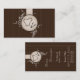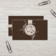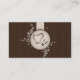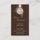 Cartão bege escuro castanho chocolate e do vintage do cozinheiro chefe e de negócio da restauração. Este cartão de negócio da restauração é serido para cafés, bistros, cozinheiros chefe, cozinheiros, comensais, e a indústria da comida e da bebida. Caracteriza um quadro do círculo com o chapéu e uma forquilha de um cozinheiro chefe e a faca dentro do quadro. O quadro pendura de uma fita e é decorado pela folha frondosa. O fundo tem listras transparentes claras. Personalize este design de cartão de visita para seu restaurante.